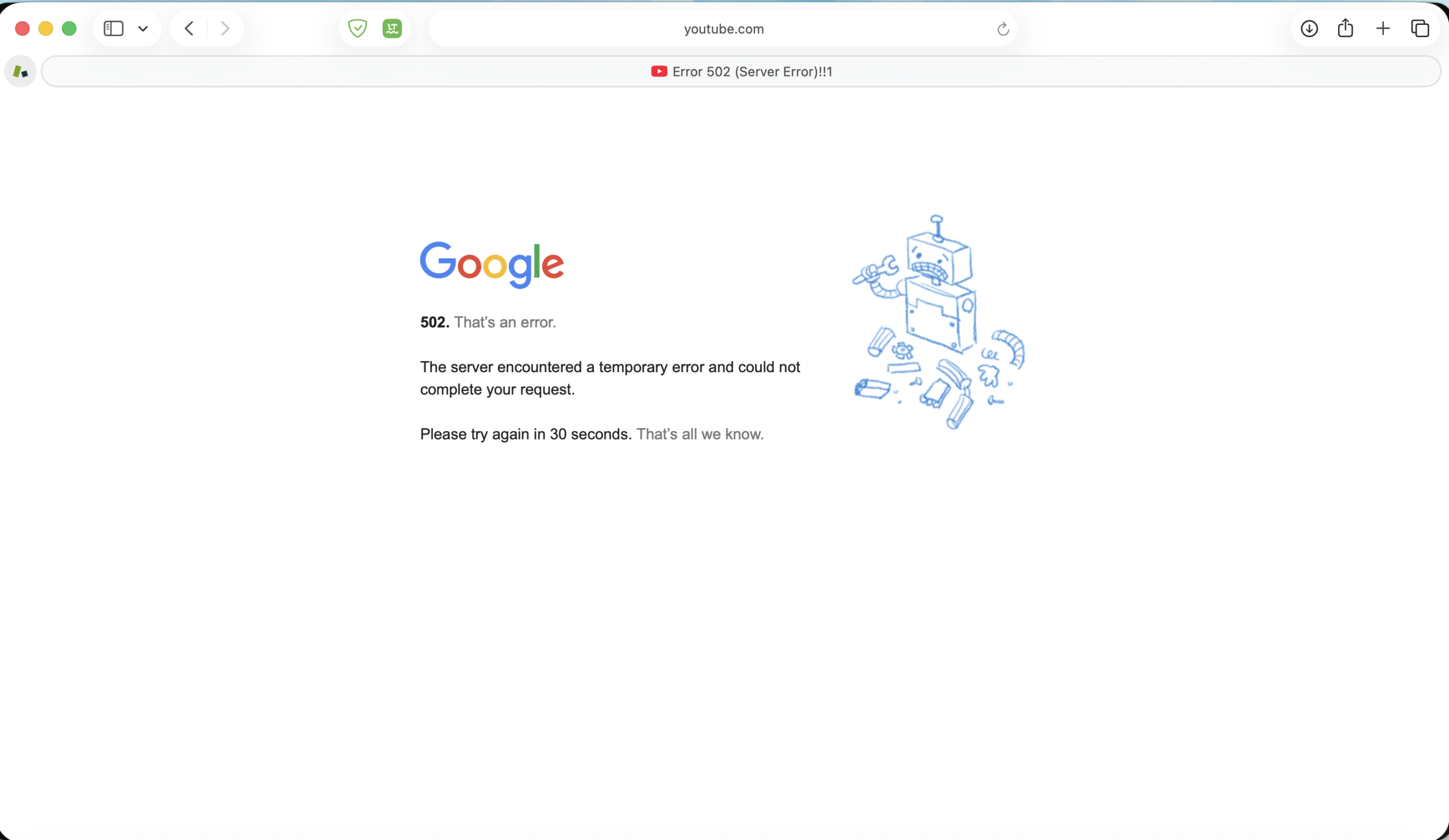 El error 502 Bad Gateway es un código de estado HTTP que indica que un servidor en internet recibió una respuesta inválida de otro servidor. En el contexto de YouTube, esto sugiere un fallo de comunicación interna en los servidores de Google o problemas con los servicios de distribución de contenido (como Cloudflare, que también reportó incidencias esta mañana).